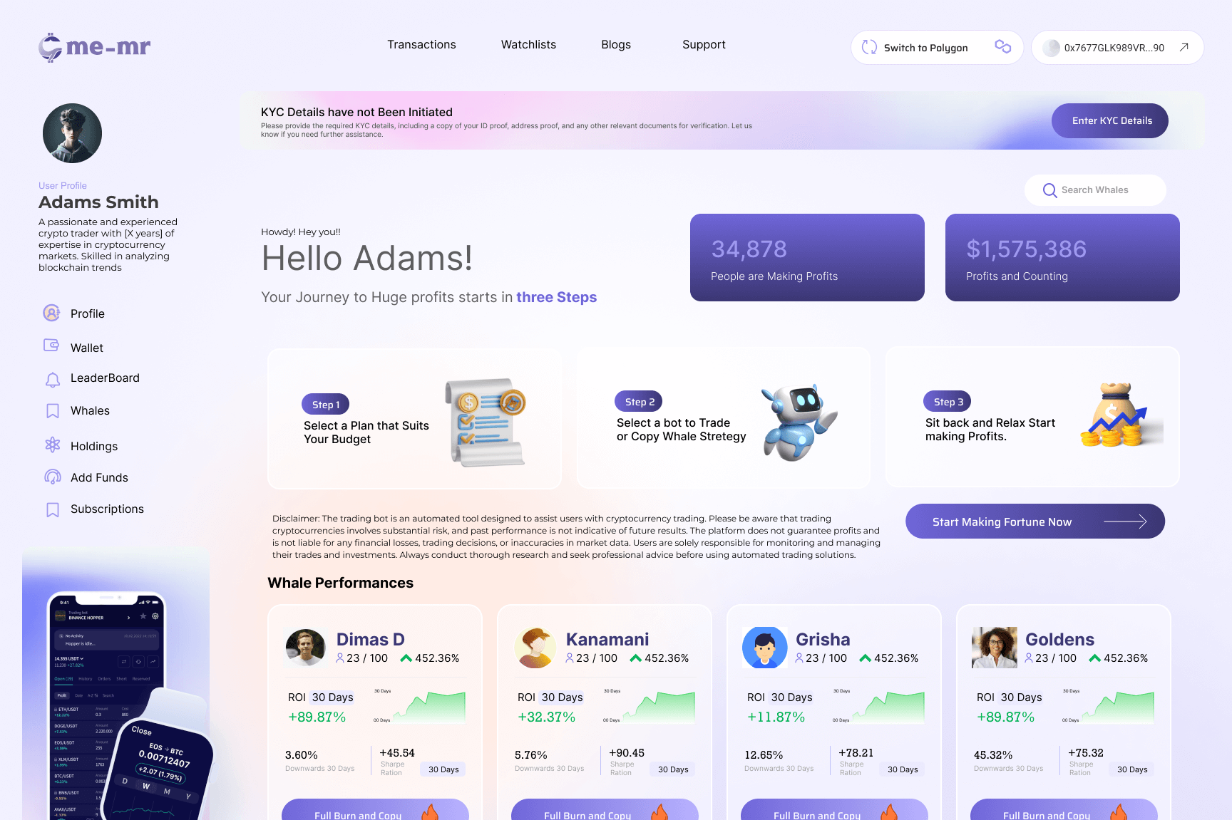 At Me-Mr, we’ve made crypto trading simple. Whether you’re a seasoned pro or a complete beginner, our AI-powered copy trading platform does all the work for you. Simply connect your wallet, sit back, and let our bots copy successful traders’ strategies automatically—without you having to lift a finger.